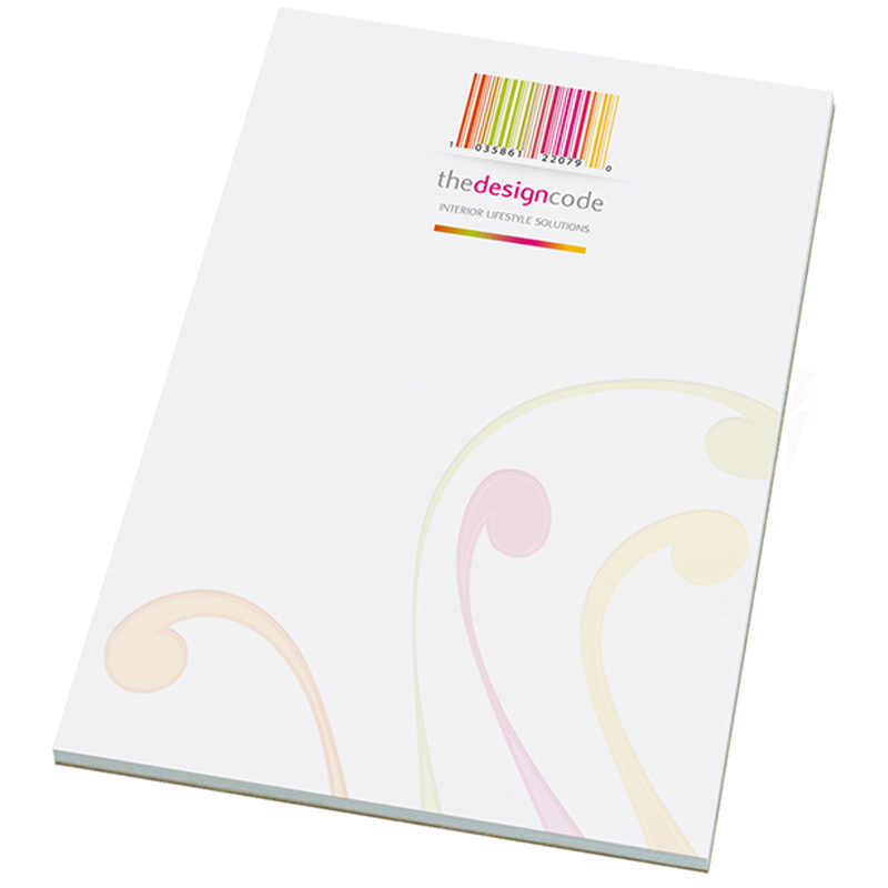 A4 Notepad containing 50 sheets of white paper from a sustainable source glued securely to a board back at head. Price is for 1 colour print to each sheet. Manufactured in the UK in our Carbon Zero factory.