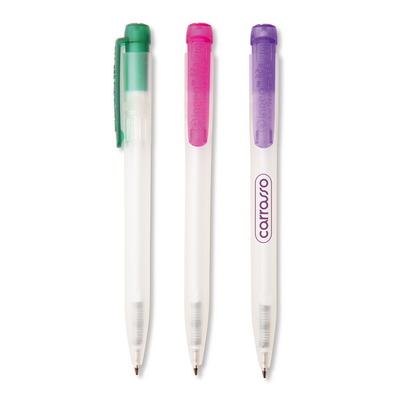 Bio S! Retractable Biodegradable, Eco Friendly Ballpen Clear Transparent Frosted Finish with Coloured Clip 80% Derived From Plants 80% Biodegradable Black Ink Refill