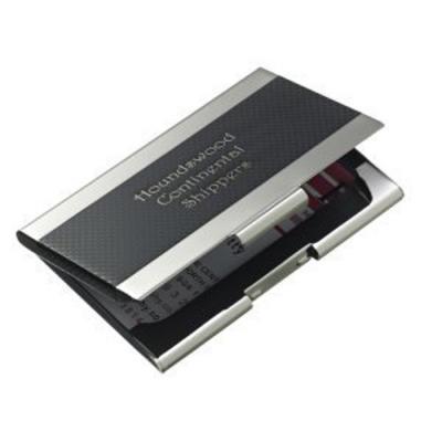Curved business card case crafted in a grained Black PU with Shiny Silver trim full length across base.