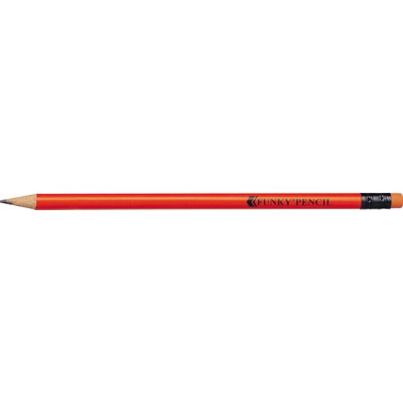 Brightly coloured wooden pencils with black ferrule and matching coloured eraser. Sharpened.