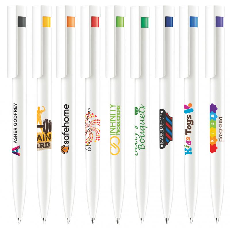 This ticks all the boxes! Opaque high-gloss finish ballpen with white barrel, and clip. Fitted with large capacity Magic Flow refill.